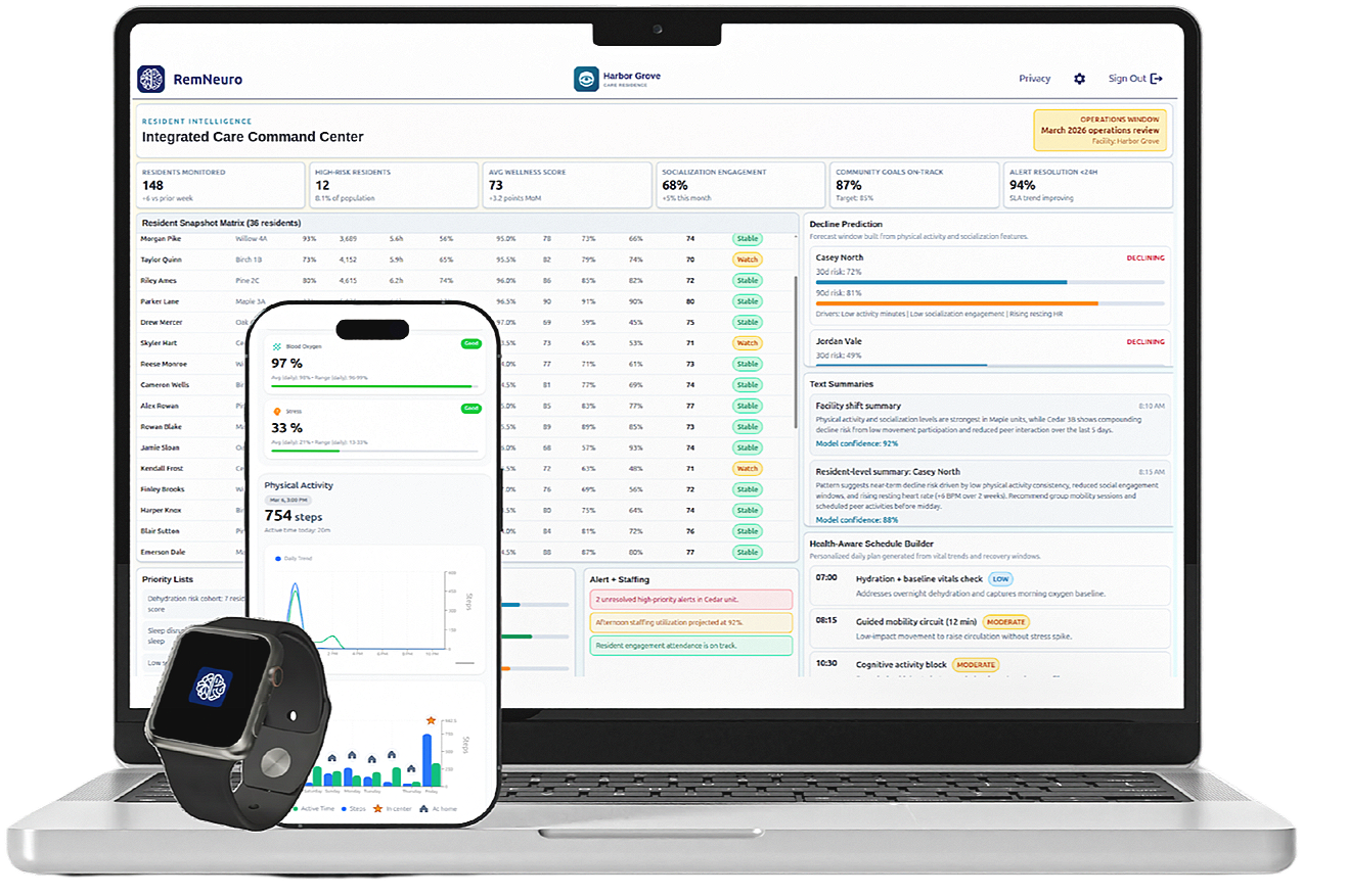RemNeuro integrates wearable-enabled health monitoring into existing care workflows, providing longitudinal health insights that support proactive, data-informed care decisions