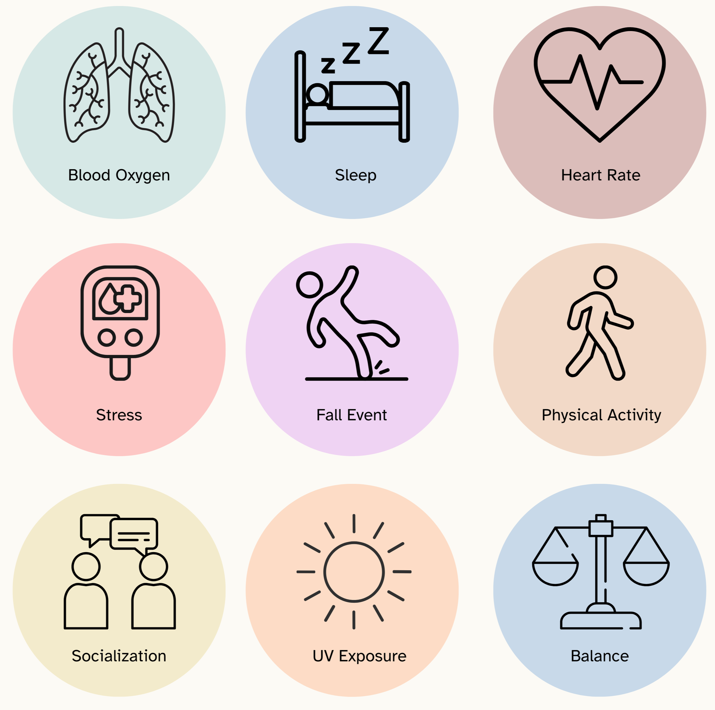 Health data, including heart rate, activity, sleep, oxygen saturation, balance, and more, is passively collected through connected wearable devices